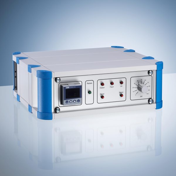 The second component is the safety monitoring of the heating elements. The two heating elements are monitored for the fixed safety limit temperature. If the internal temperature of one of the two heating elements (jet and heater) rises above the set safety limit temperature, the safety device switches off the cold gas system and sounds an alarm. The system can only be switched back on manually.