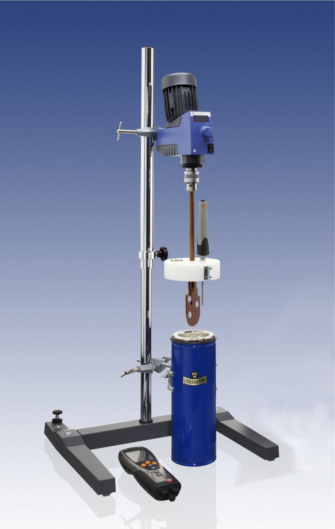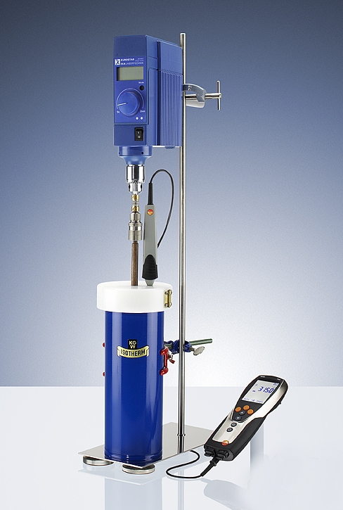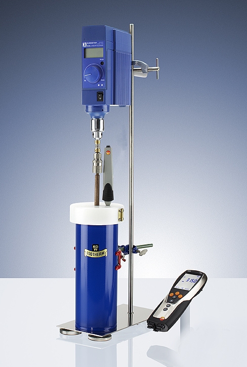 For the reaction process, 150 +/- 0.5 g of undissolved lime is added to the Dewar vessel, which contains 600 +/- 1 g of distilled water at approx. 20° C. As the contents of the Dewar flask must be completely mixed throughout the entire duration of the experiment, this apparatus is equipped with an agitator (speed 350 +/- 1/min).